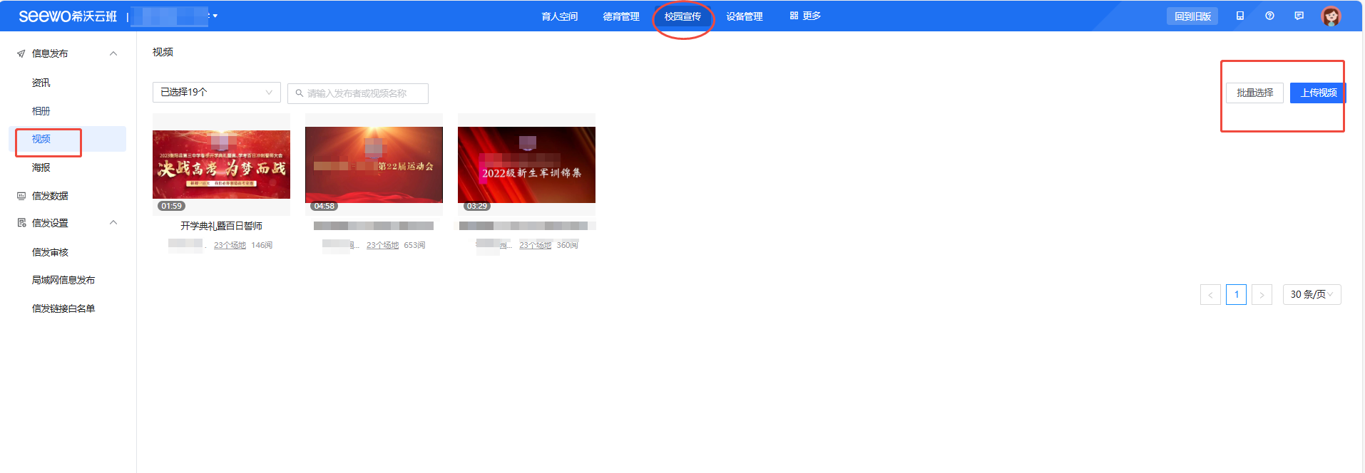 管理员可以点击【校园宣传】【上传视频】按钮,将选定的视频上传到希沃云班