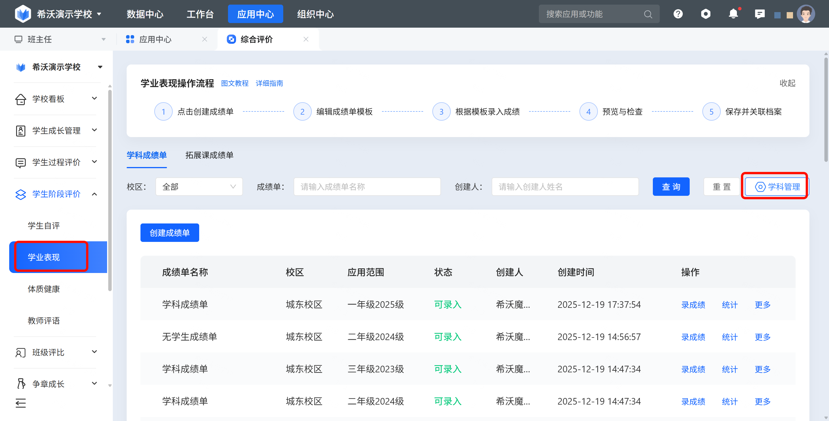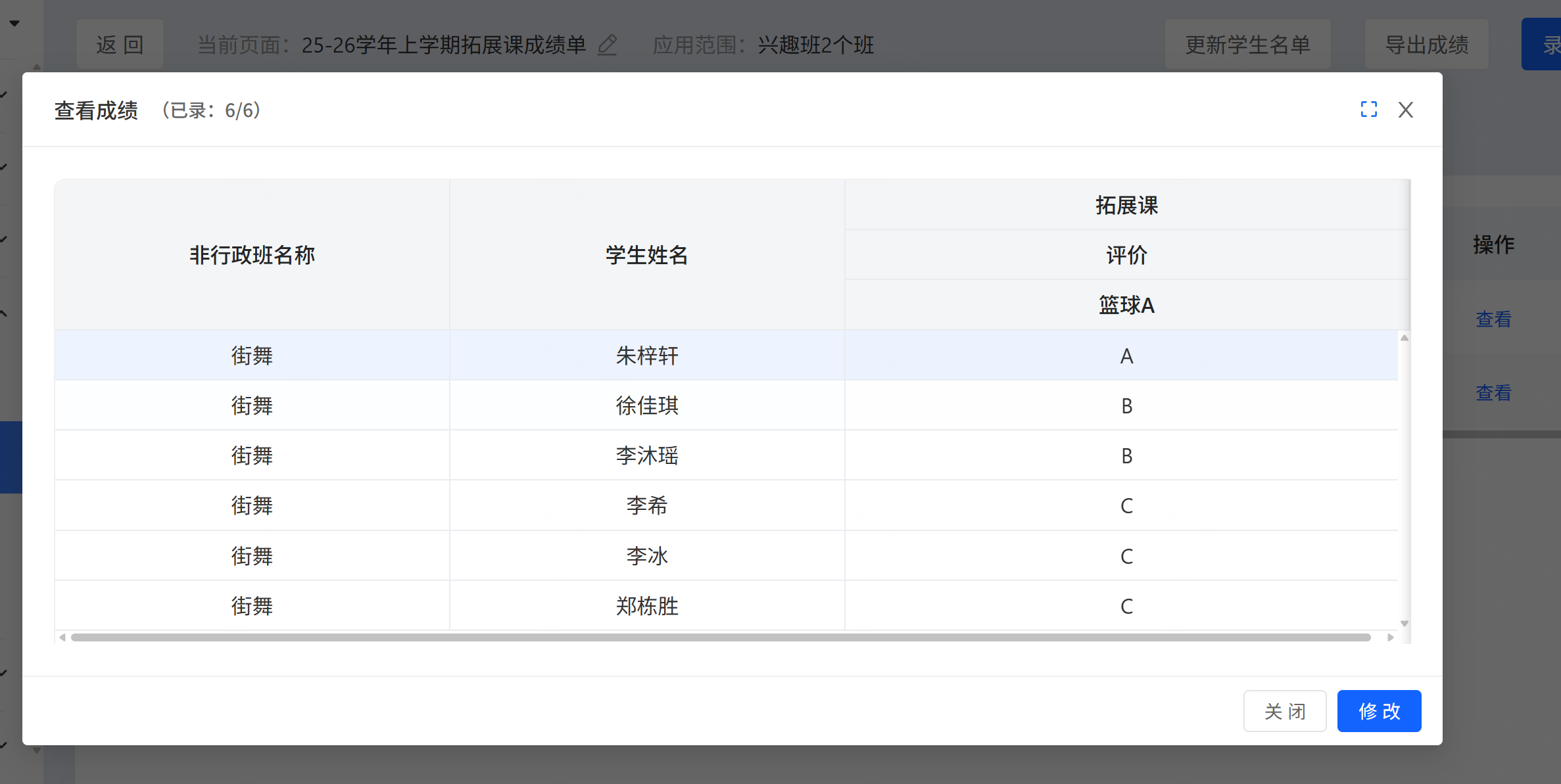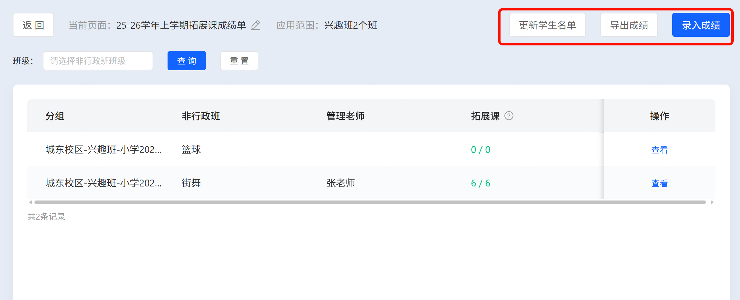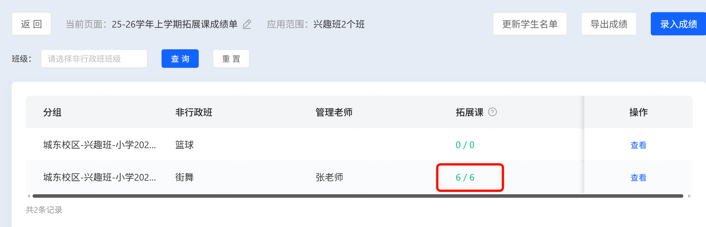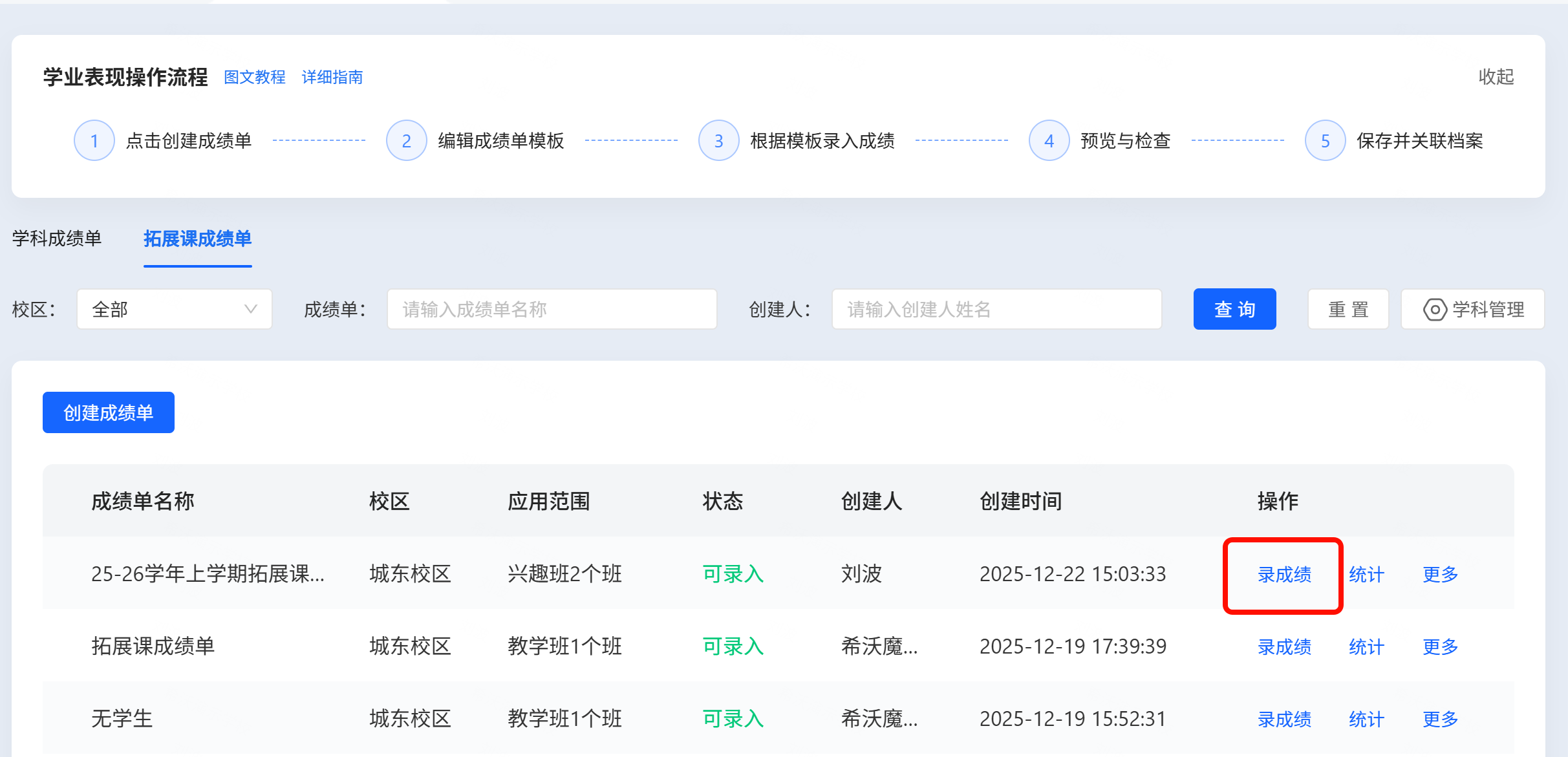 创建完成之后,拓展课成绩单,仅学校管理员、非行政班管理老师、副管理老师,管理范围涵盖非行政班的老师可以进行录入。