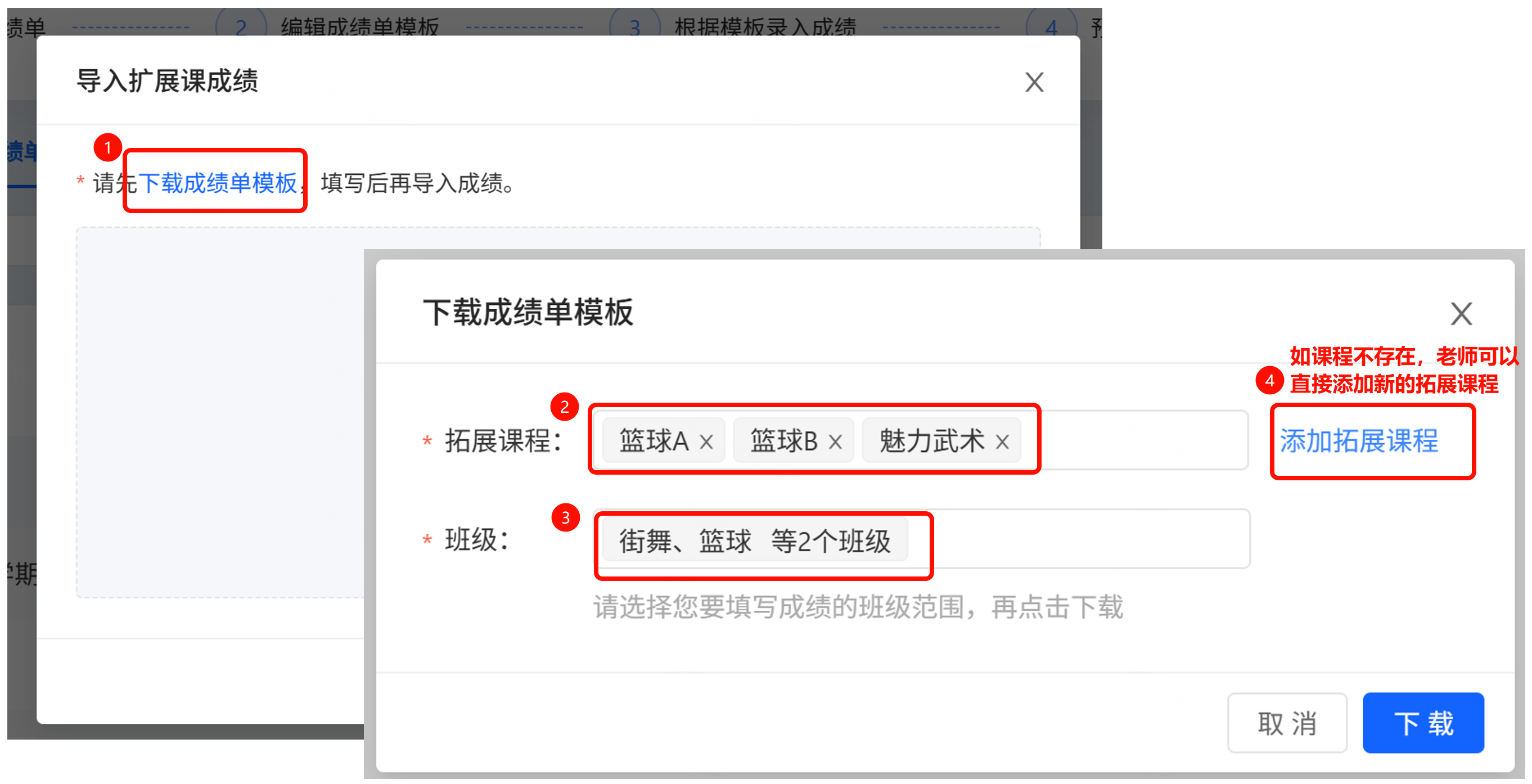 第二步,选择拓展课程以及需要录入的班级,下载成绩单模板。