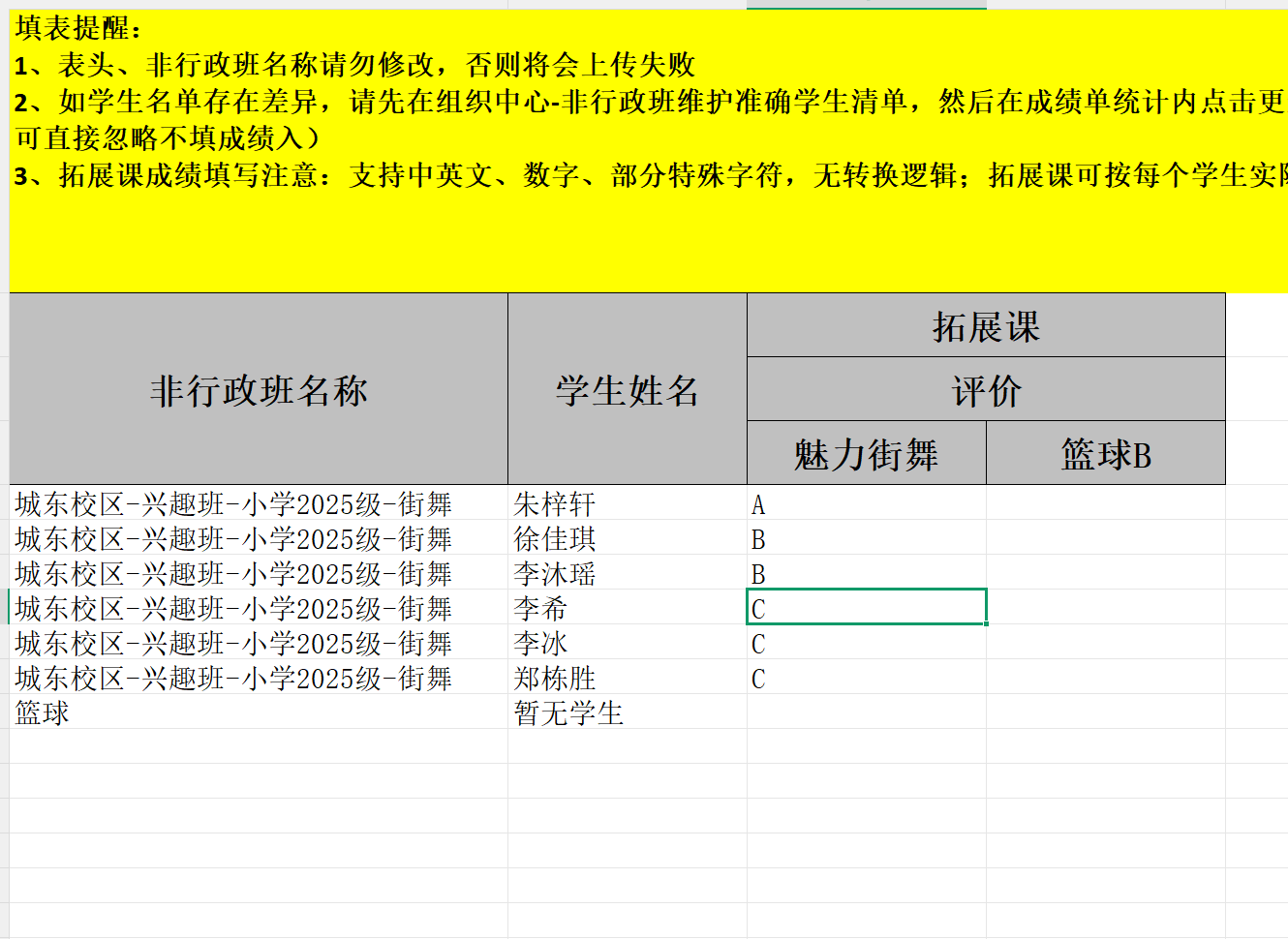 导出来的样表会自动带出非行政班和学生姓名,教师或管理员只需填写学生成绩即可;