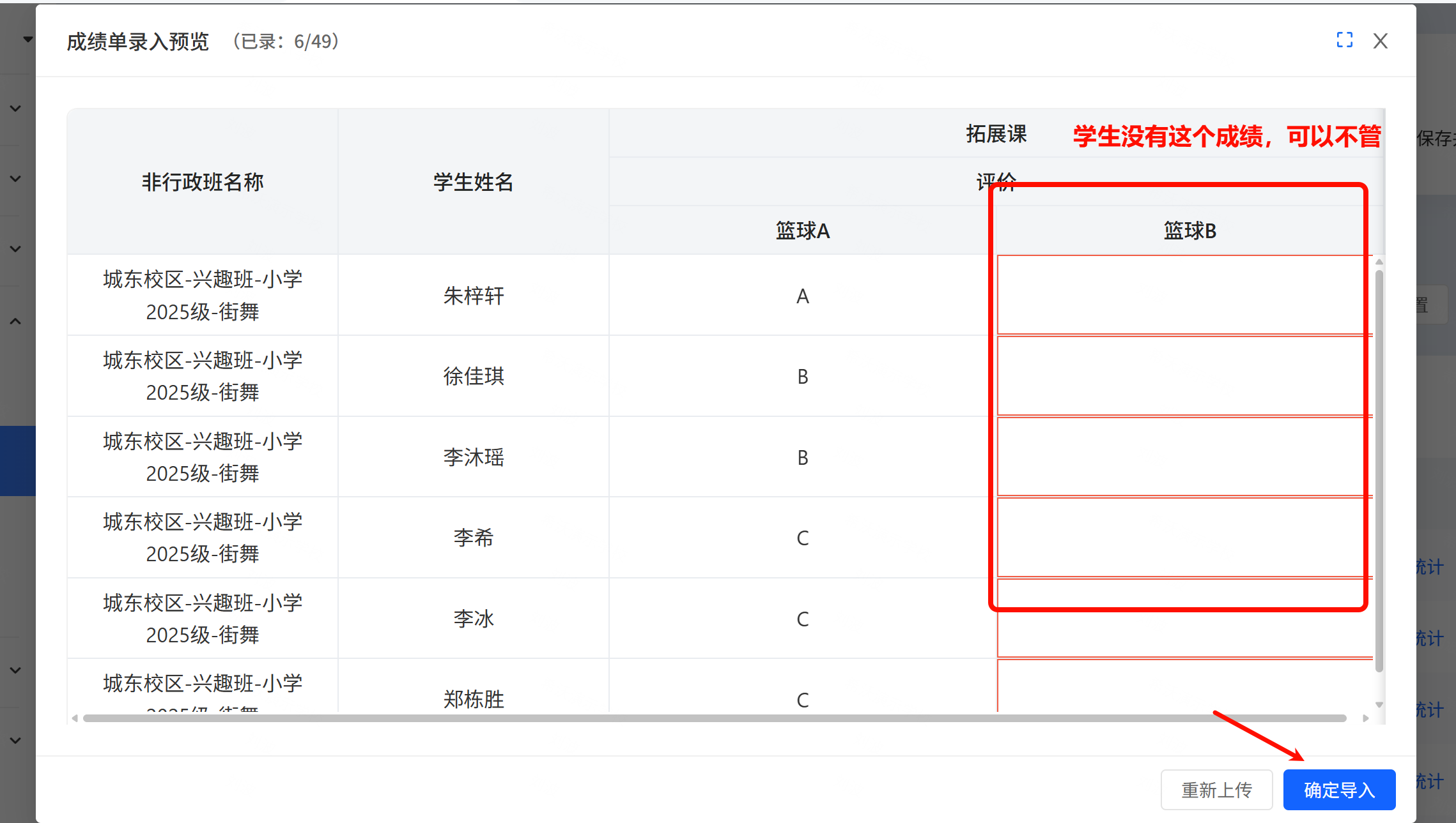 系统自动校验是否导入有缺少成绩,如多个班同步导入,缺少的提示可以不用处理。