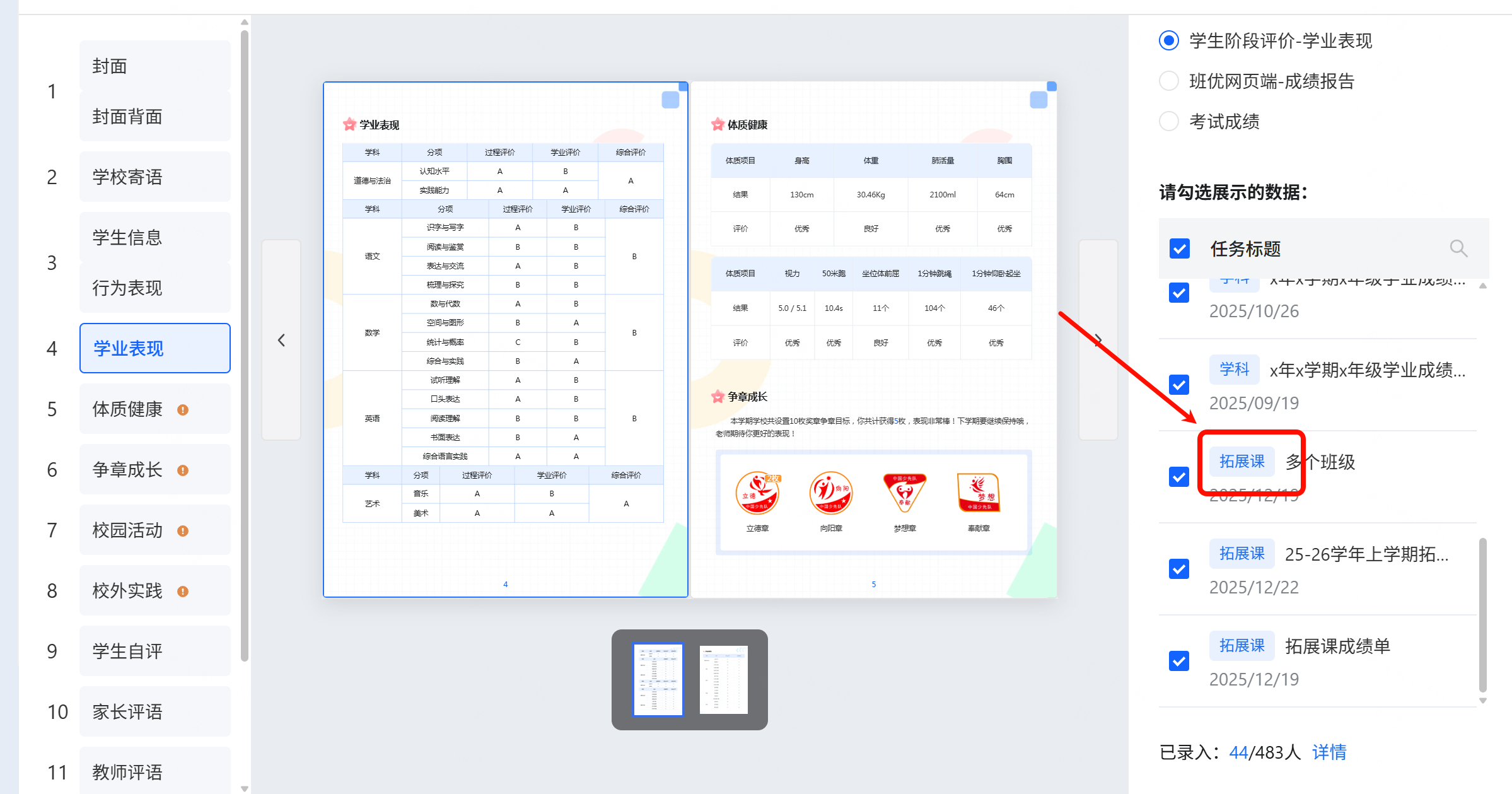 录入拓展课成绩后,成绩单在创建档案时会进行显示,勾选后即可在成绩单显示。